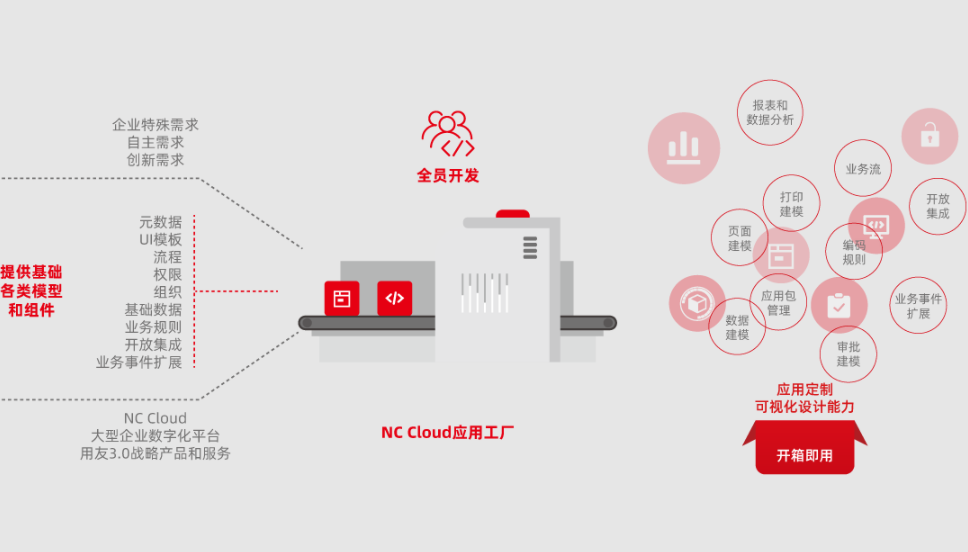 用友NC Cloud應(yīng)用工廠作為零代碼開發(fā)平臺,為企業(yè)提供了各類基礎(chǔ)模型和組件(如元數(shù)據(jù)、UI模板、流程、權(quán)限、組織、基礎(chǔ)數(shù)據(jù)、業(yè)務(wù)規(guī)則、開放集成、業(yè)務(wù)事件擴展等),支持全員開發(fā),真正開箱即用,基于個性化定制開發(fā)的模式,滿足企業(yè)在數(shù)智化時代的自主創(chuàng)新需求。