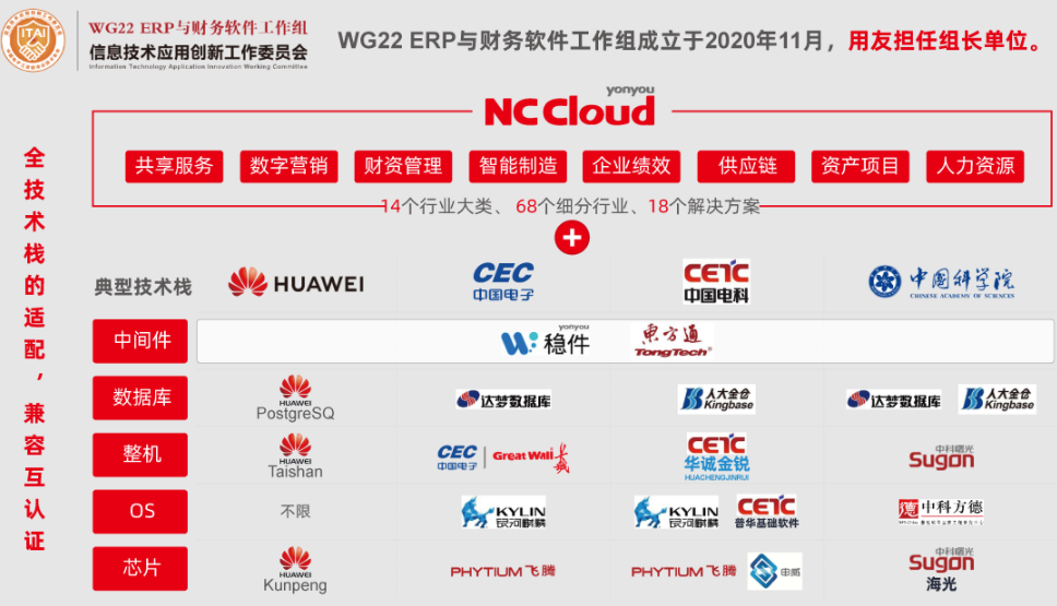 為了推動信創(chuàng)產(chǎn)業(yè)發(fā)展,用友參與了信創(chuàng)聯(lián)盟、信創(chuàng)工委會、WG22 ERP與財務(wù)軟件工作組等組織機構(gòu)。用友NC Cloud與華為鯤鵬體系和中國電子PKS體系等國內(nèi)主流的信創(chuàng)產(chǎn)品進行全棧適配。截止2021年5月,用友NC Cloud已與近50個國產(chǎn)化產(chǎn)品實現(xiàn)兼容認(rèn)證,形成安全可信的數(shù)智化解決方案。