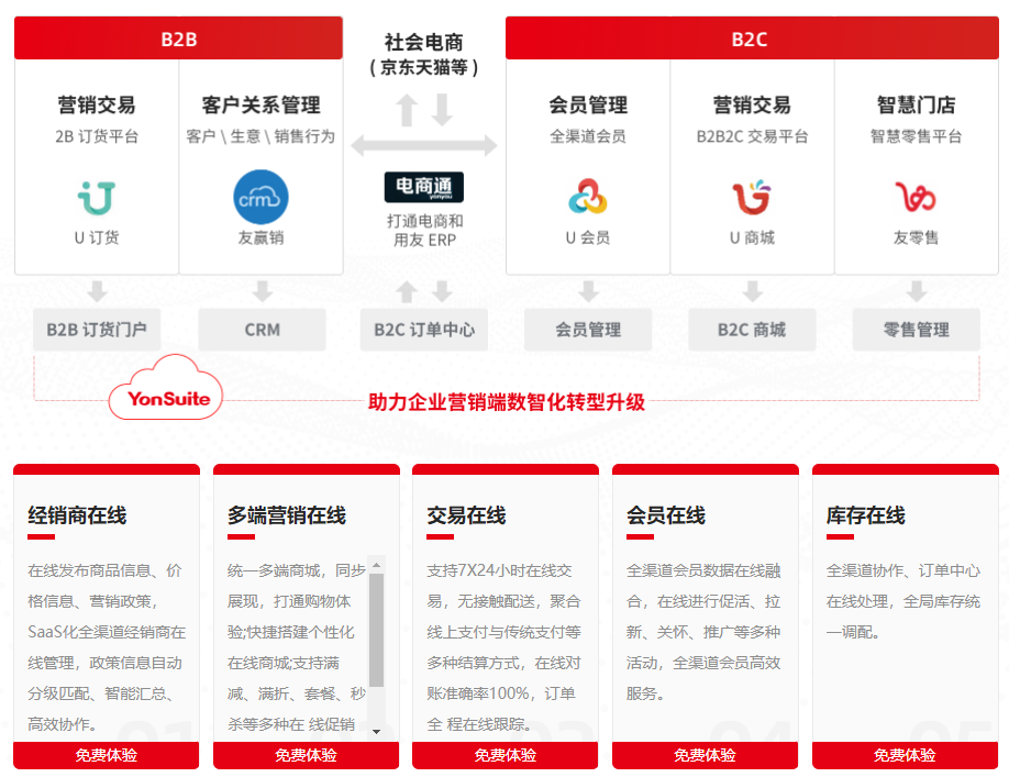 互聯(lián)網(wǎng)的普及徹底顛覆了企業(yè)的傳統(tǒng)交易模式,消費習慣也隨之改變,B2B 與 B2C 業(yè)務(wù)與互聯(lián)網(wǎng)深入融合,線上業(yè)務(wù) 飛速發(fā)展。YonSuite 天然的云原生讓企業(yè)從經(jīng)銷商到會員,從交易到庫存到結(jié)算和對賬可以全在線完成,通過大數(shù)據(jù)驅(qū)動 精準營銷,智能購物體驗可以有效增強客戶粘性。