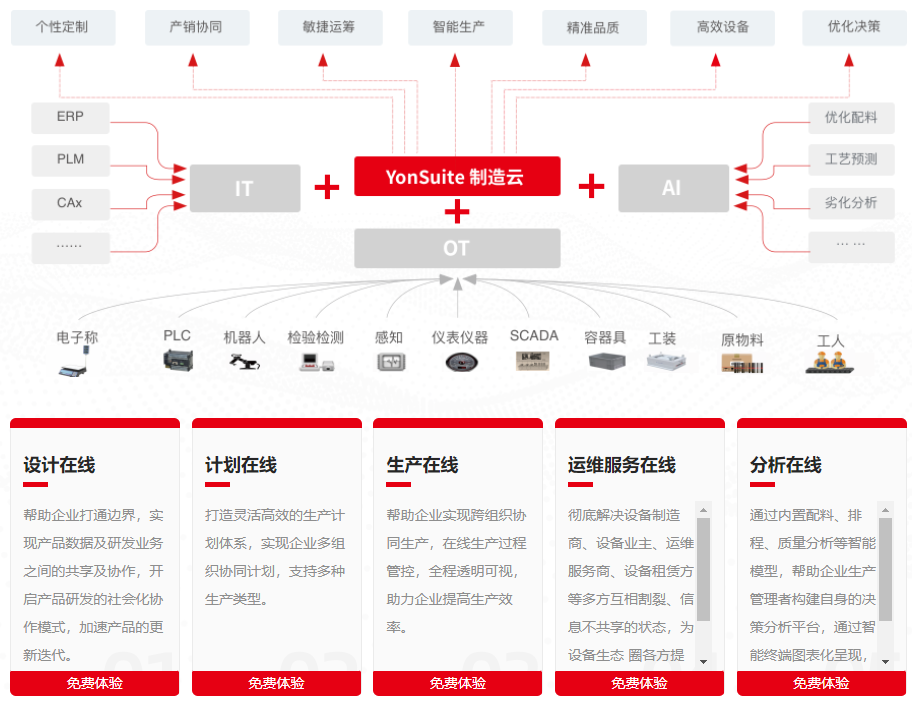 高效配置生產(chǎn)資源、低成本提高交付能力是制造企業(yè)普遍的需求。YonSuite 通過業(yè)務(wù)和數(shù)據(jù)中臺,在線連接PLM、WMS、MES、loT等制造服務(wù),為企業(yè)提供個性化智能制造升級路徑,幫助制造企業(yè)實現(xiàn)設(shè)計、計劃、生產(chǎn)、設(shè)備服務(wù)等全業(yè)務(wù)在線執(zhí)行,并可動態(tài)監(jiān)控生產(chǎn)全過程,高效響應(yīng)客戶需求。